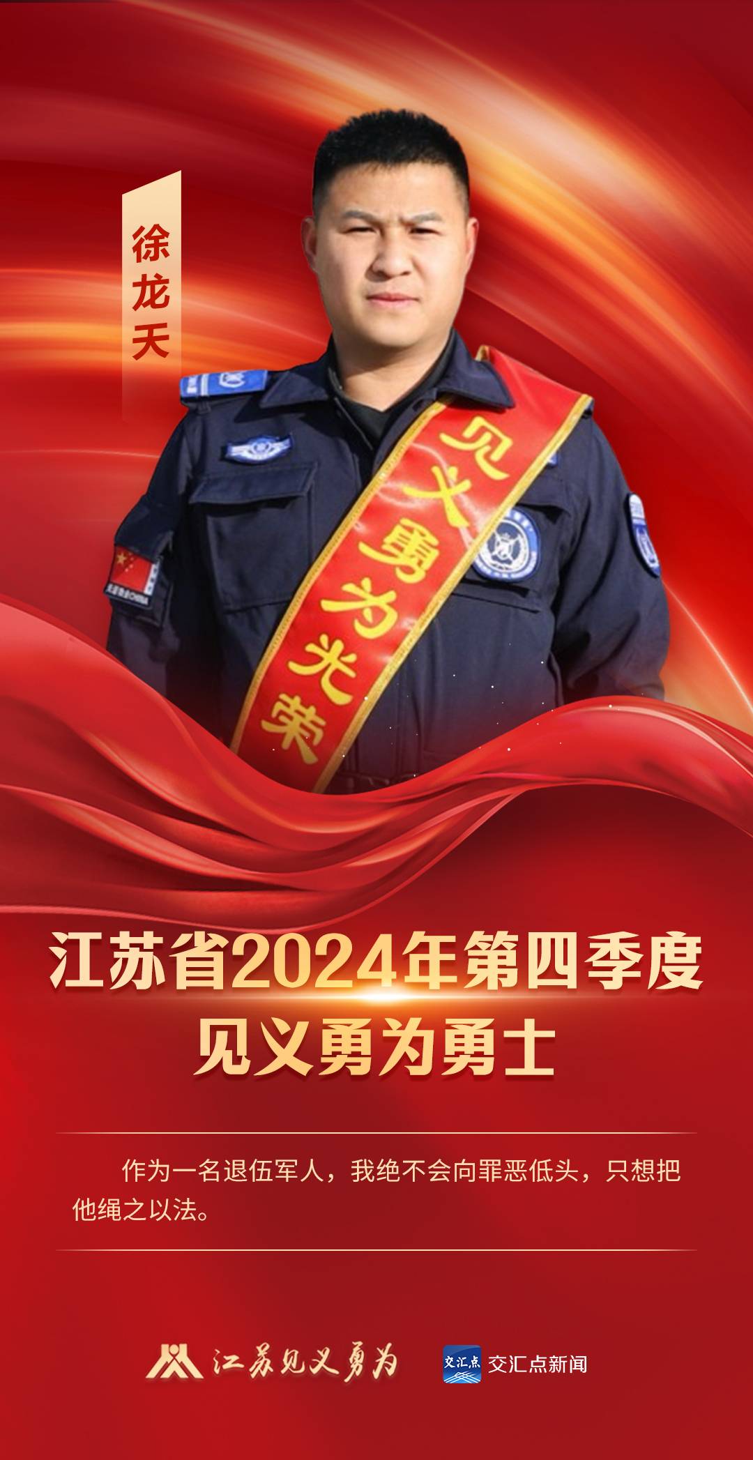 看成别称退伍军东谈主,徐龙天耐久秉持着军东谈主实质,敢于担当、果敢丧胆。自从2012年从事物业措置职责后,他耐久相持作念到敢于和坐法违游记径作贸易,爱戴住户财产利益,他先后11次勇斗伏莽,匡助公安机关握获盗窃嫌疑东谈主15东谈主,转圜经济失掉10万余元。在屡次追击伏莽中,他的身上未免有一些擦伤、摔伤,有东谈主问他:“靠近凶恶的歹徒,难谈你就不怕呢?这样拚命图啥呀?”他摆摆手笑谈:“看成别称退伍军东谈主,我决不会向邪恶俯首,只思把他绳之以法。”